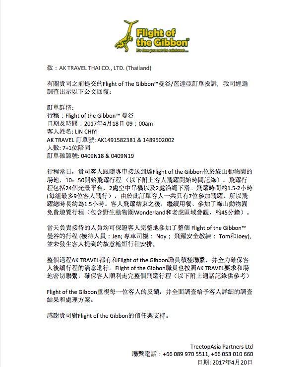 當了解顧客問題時,AK工作人員立即與相關部門負責人、廠商(Flight of the Gibbon)窗口聯絡、查詢,積極協調廠商解決問題。發現接送誤點起因於,廠商票務專員誤將內部作業資料記載的顧客下榻飯店資訊,[email protected],[email protected],安排與回覆AK的接送時間點為Pattaya飯店接駁時間,而非曼谷飯店的接駁時間,導致當天顧客在指定地點久候。AK與廠商都相當重視顧客服務與問題解決,因此,處理過程中, AK嚴格要求廠商須積極處理該客戶的問題與需求,Flight of the Gibbon亦積極配合處理。AK工作人員當時與廠商窗口保持密切聯繫,持續追蹤確認廠商是否完成我方要求。 Flight of the Gibbon當日發覺報名的8位成員包含一位孕婦,基於安全因素,主動提出懷孕的旅客不宜進行飛躍體驗的建議,改採陪同方式參與,亦安排該名旅客(孕婦)相關費用處理;「安全」是雙方最重視的議題。Flight of the Gibbon中文專員協調內部工作人員問題解決同時,亦不斷電話關心及關切顧客體驗活動進度,直至顧客順利完成體驗活動。提供叢林飛躍服務公司眾多,AK選擇Flight of the Gibbon的原因,除了該公司符合國際安全標準外,面對顧客問題,能積極協助來自AK顧客的問題處理,不曾推託責任。我們相信Flight of the Gibbon團隊與AK團隊當下提供的協助與各項補償都基於善意與願意承擔責任的前提下,提供相關服務與補償。(補充:AK僅有員工制服,不曾設計形象服贈予顧客。)