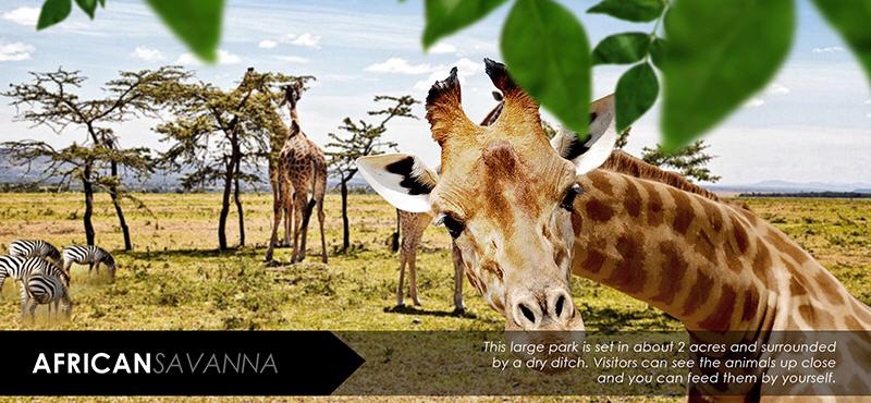 薩瓦納大草原動物區是根據“動物地理” (Zoo Geographic Theme) 設計的。也就是說,該區是根據動物的起源而設計的,強調環境設計以及設備必須與起源地相似。內有多種動物如長頸鹿、斑馬、鴕鳥、白犀牛、大羚羊、跳羚、長角羚等,共同生活在同一生活區,此區面積為5萊,周圍是乾燥的壕溝。遊客可以親近動物並餵食。