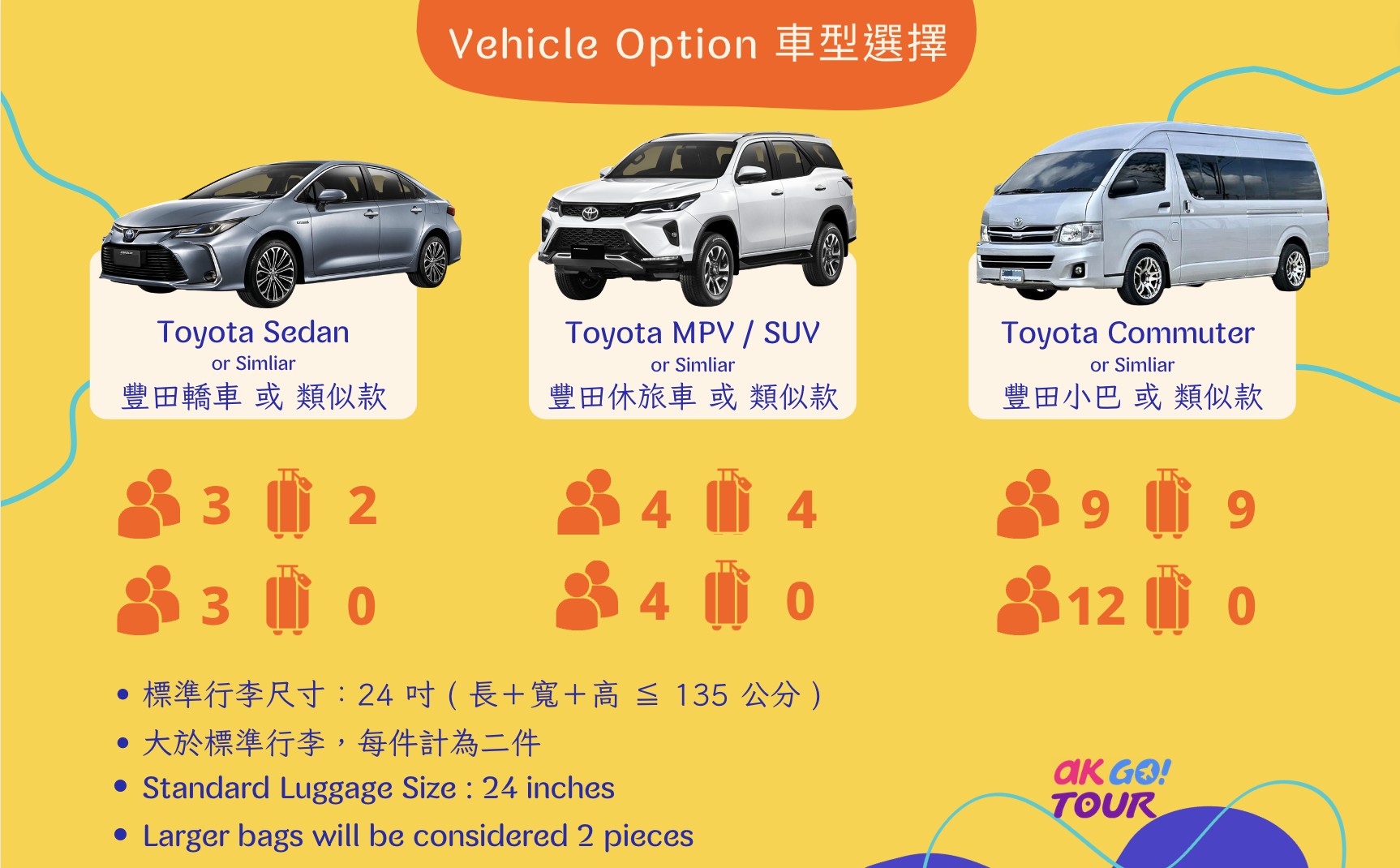 請依建議人數選擇車型,若人數更多需要巴士接送,請洽 AK GO Tour客服 諮詢。