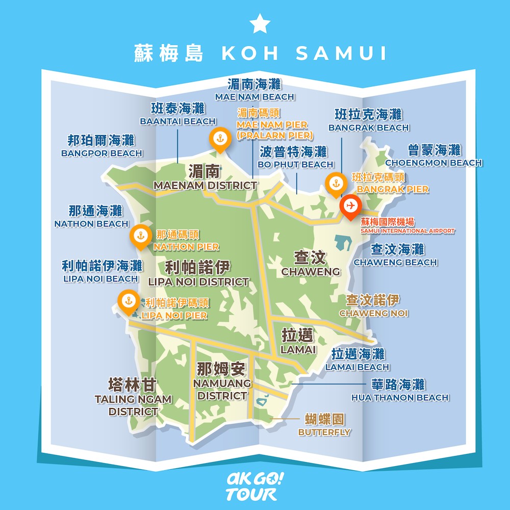 - 由蘇梅島 (Koh Samui) 不同地區,前往蘇梅國際機場 Samui International Airport (USM)。
