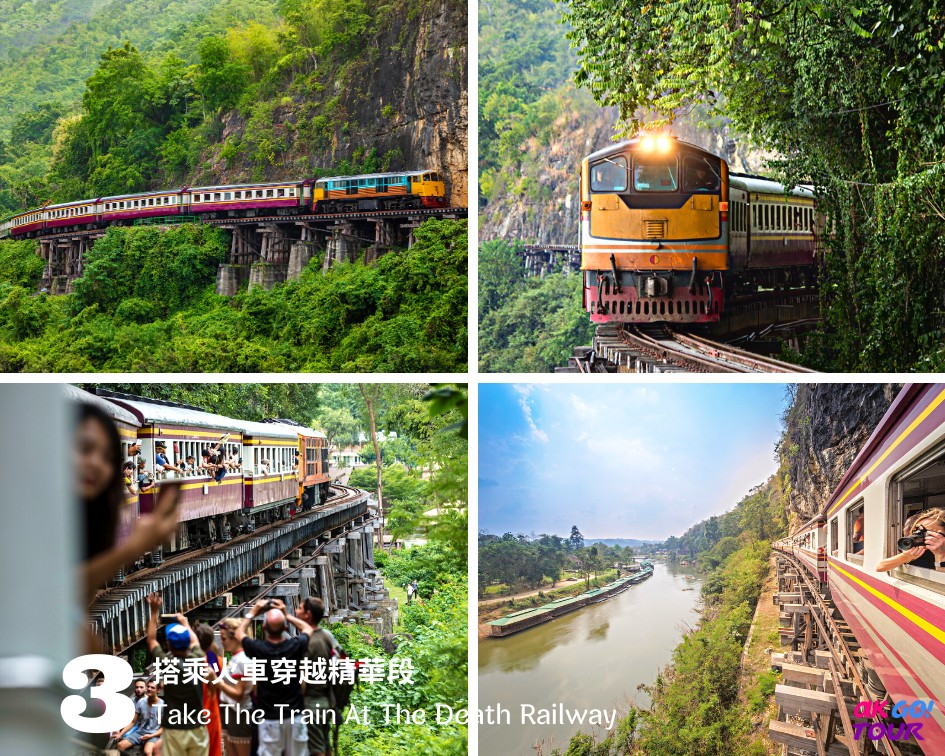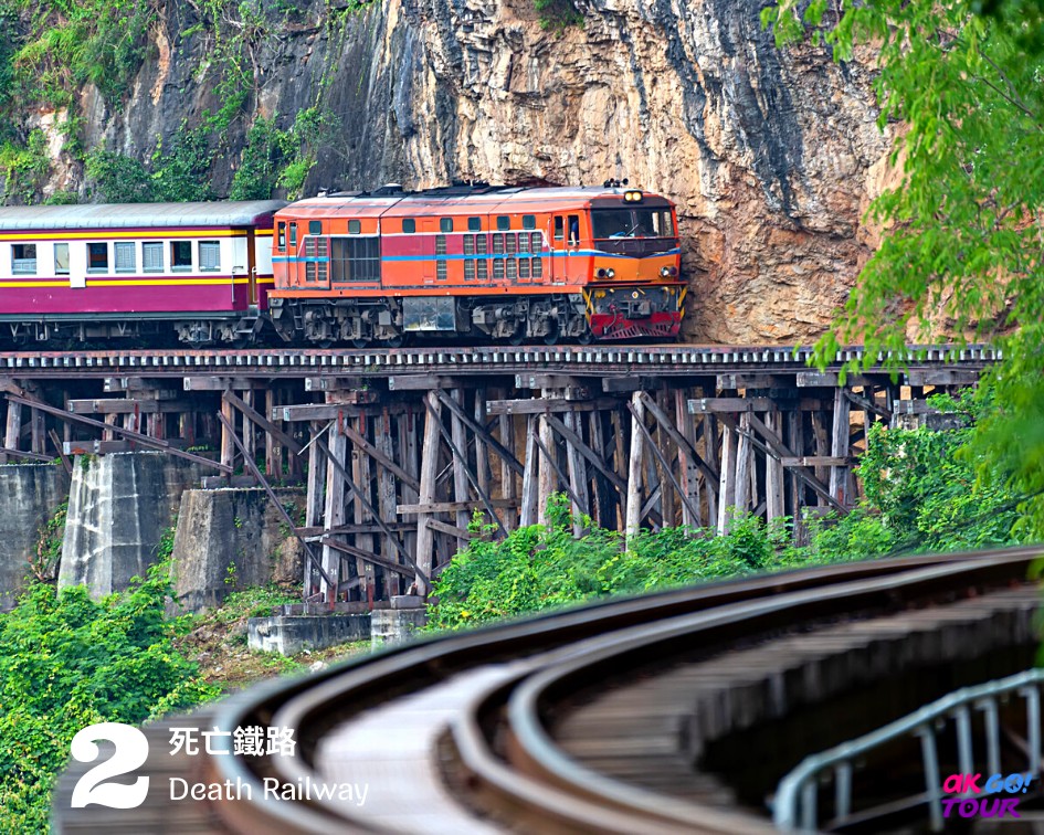 - 搭乘泰緬鐵路火車,捱著山壁行駛,感受二戰期間最嚴竣壯麗的木造鐵道路段。