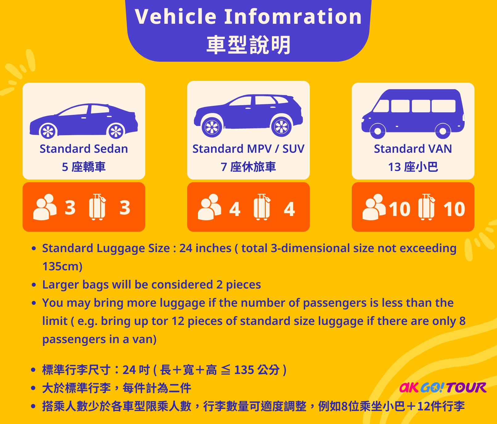 - 預訂時,請選擇適合出遊人數的車輛。如接送當日的出遊人數不適合所選車輛容量,將有權要求預訂額外車輛。