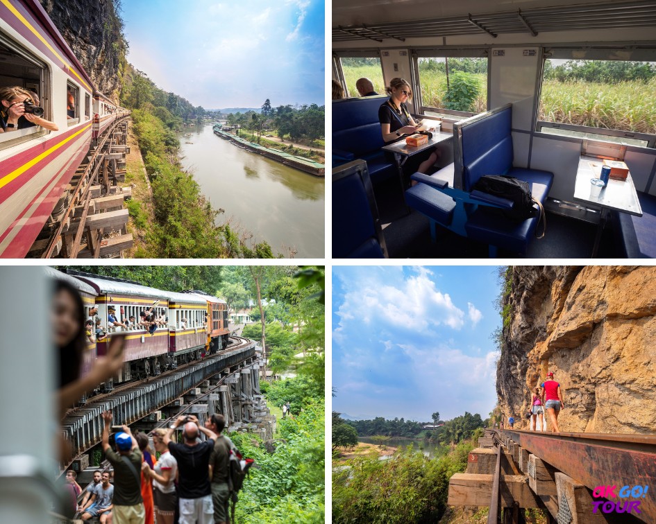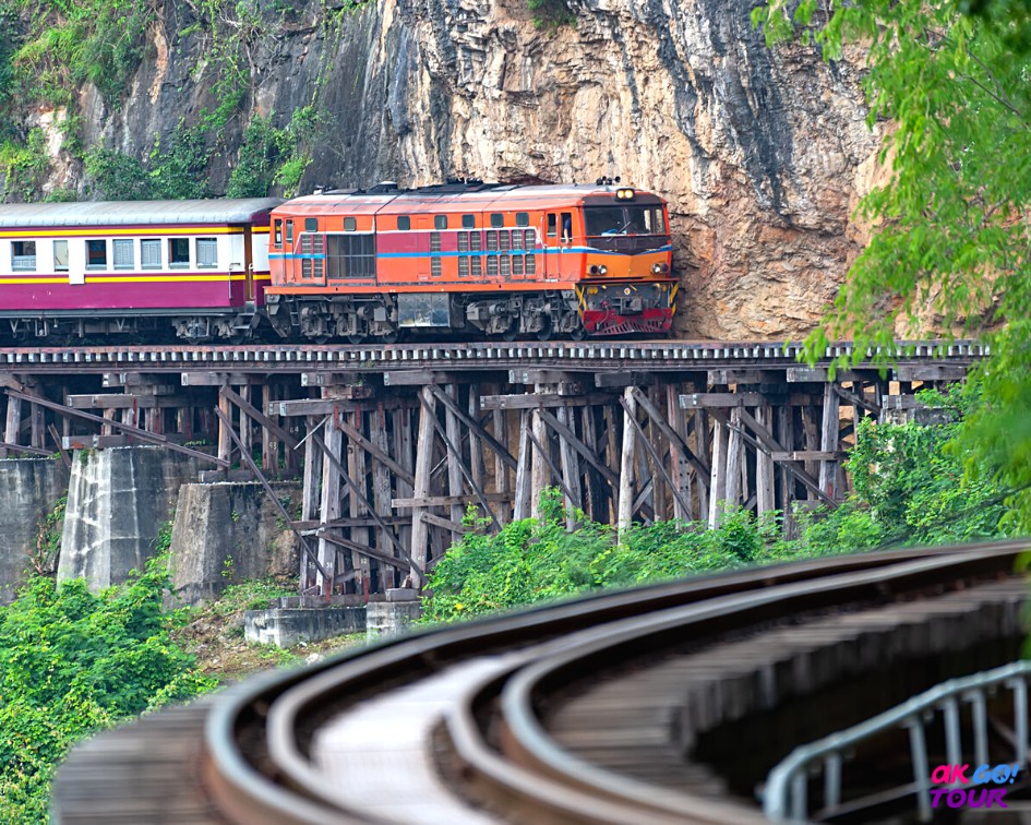 二次大戰日軍強迫盟軍戰俘建造泰緬鐵路,行經桂河大橋之外,還有一段捱著陡峭山壁而蓋的「死亡鐵路」,因為施工困難,建造時犧牲了很多生命。我們會搭乘約20分鐘的火車,經過死亡鐵路景致最壯麗,也是工程最嚴竣的一段,火車行駛於懸空的木製鐵道上,一邊是山崖、一邊是桂河,讓人讚嘆不已,在按下相機快門的同時,更加緬懷腳下鐵軌的歷史。