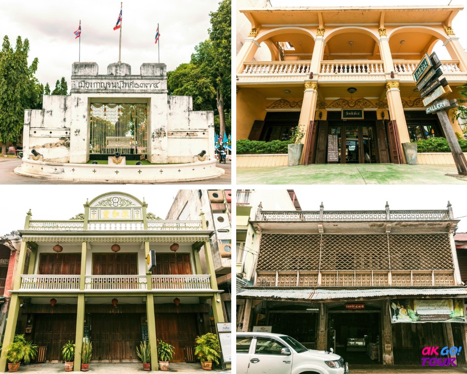 北碧舊城區有一條百年歷史的遺產步行老街,這兒的前身是在二戰期間的熱鬧商業貿易區,隨著城鎮重心轉移,現在成了喧囂轉角的寧靜街坊,少有觀光客。步行老街窄窄的,沿途卻十分精彩,有各式風格的建築,像是葡式、中式及泰式特色的傳統獨棟兩三層樓街屋,都是見證過二戰,而留存下來的百年建築。