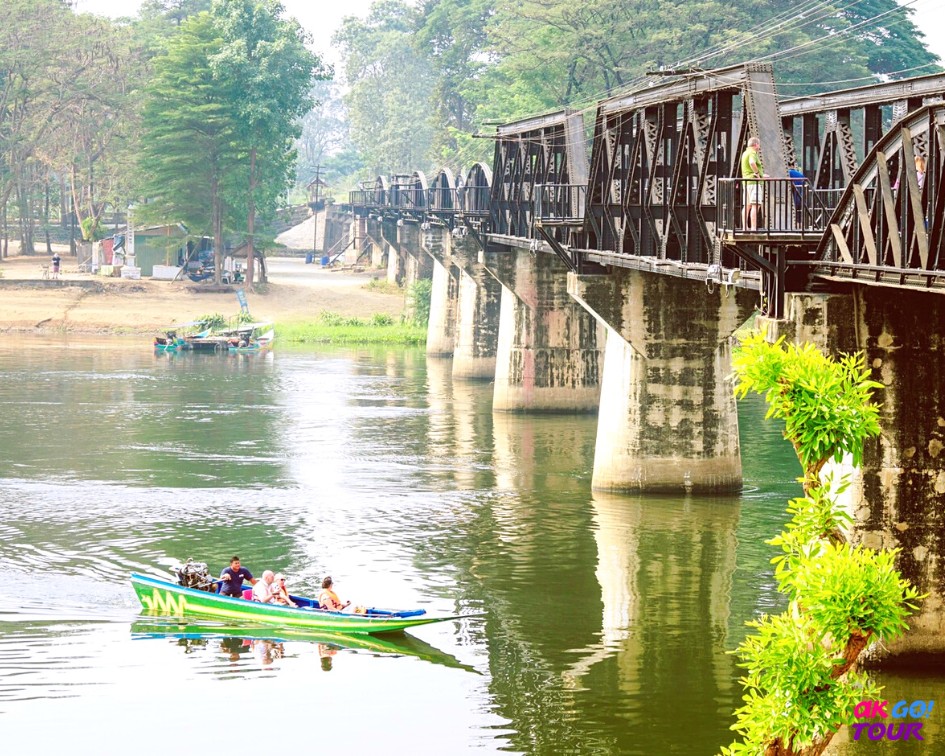 乘著詩情畫意的遊船,來到有「泰國亞馬遜」稱號的桂河流域,沿著兩岸叢林蓊蓊鬱鬱,查看生態環境和發展。再往桂河大橋方向行駛,由橋下穿越桂河大橋,更加深刻的記住這永恆的歷史景點。黃綠色的河水隨著蜿蜒地形靜靜的流淌著,婉約秀氣別有一番風味。在船上享用AK精心準備、當地排隊名店特製的傳統泰式點心,暫時遺忘所有煩惱,任由藍天、白雲、微風、河水,洗滌旅程疲憊的身心。