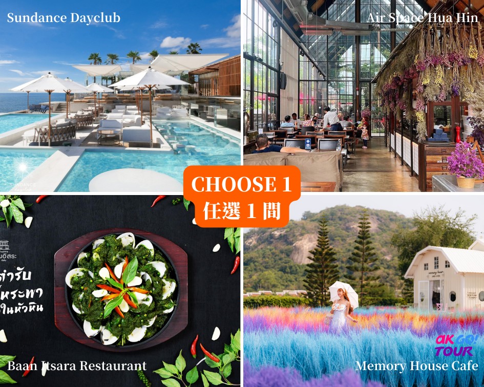 嚴選4間網紅餐廳供您選擇前往;環境悠美、值得留下美好照片,餐點美味,吃飽了再往回曼谷。喜歡海景選擇泰+西式餐點,選擇Sundance Dayclub;欣賞泰式設計,選擇泰+西式餐,前往Air Space Hua Hin;老饕覓食,選擇道地海鮮名店 Baan Itsara;美拍色彩園野,探索Memory House Cafe。