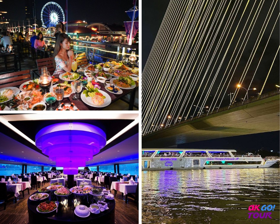 - 乘坐昭披耶河公主號,欣賞夜幕降臨後的湄南河夜景,大啖自助晚餐