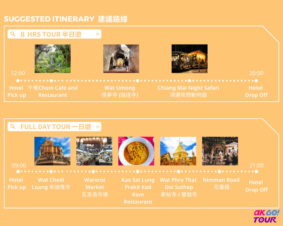 - 所有套餐,僅適用 1. 去回程在清邁市區接送;2. 多日包車,晚上入住清邁市區飯店。若過夜入住飯店非位於清邁市區,例如湄康蓬、湄登、湄林…等郊區,需支付司機/導遊過夜住宿補貼,每位500泰銖。