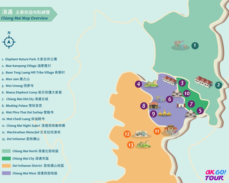 清邁府腹地廣大、多山區,服務範圍包含主要景點如下圖。
