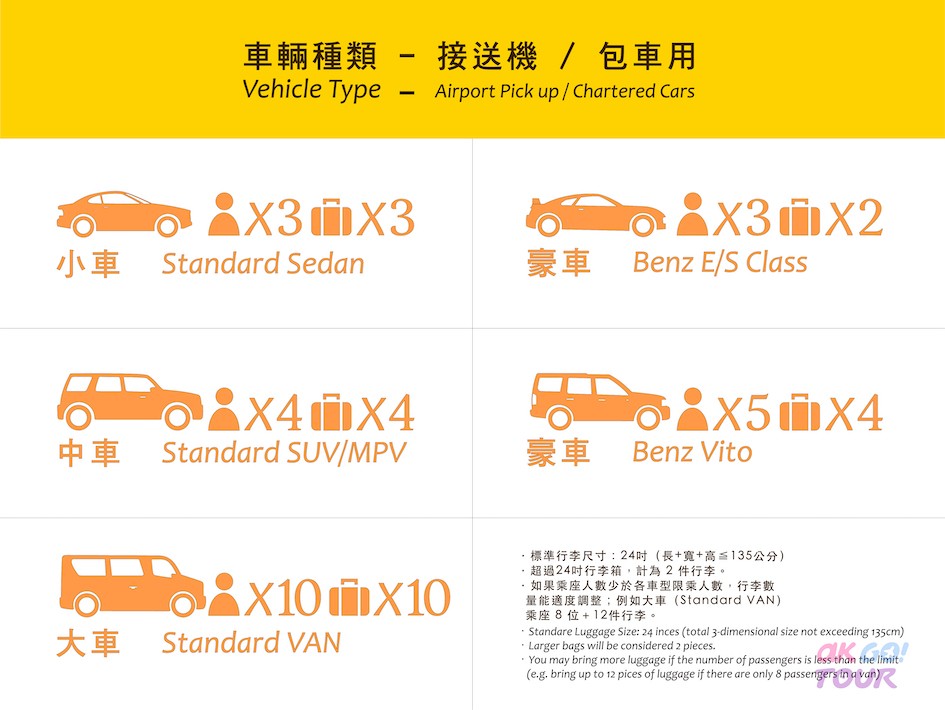 - 預訂時,請選擇適合出遊人數的車輛。如接送當日的出遊人數不適合所選車輛容量,將有權要求預訂額外車輛。