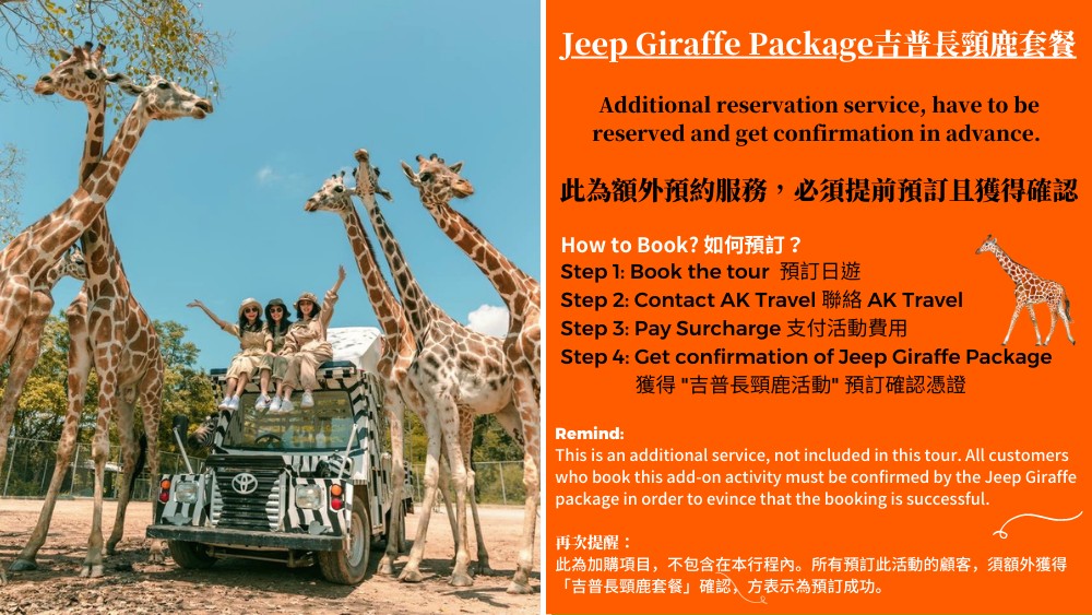 欲加購「私人吉普長頸鹿套餐」,請先聯絡AK GO客服,若自行在此商品頁自行下單預訂,AK GO將取消您的訂單。