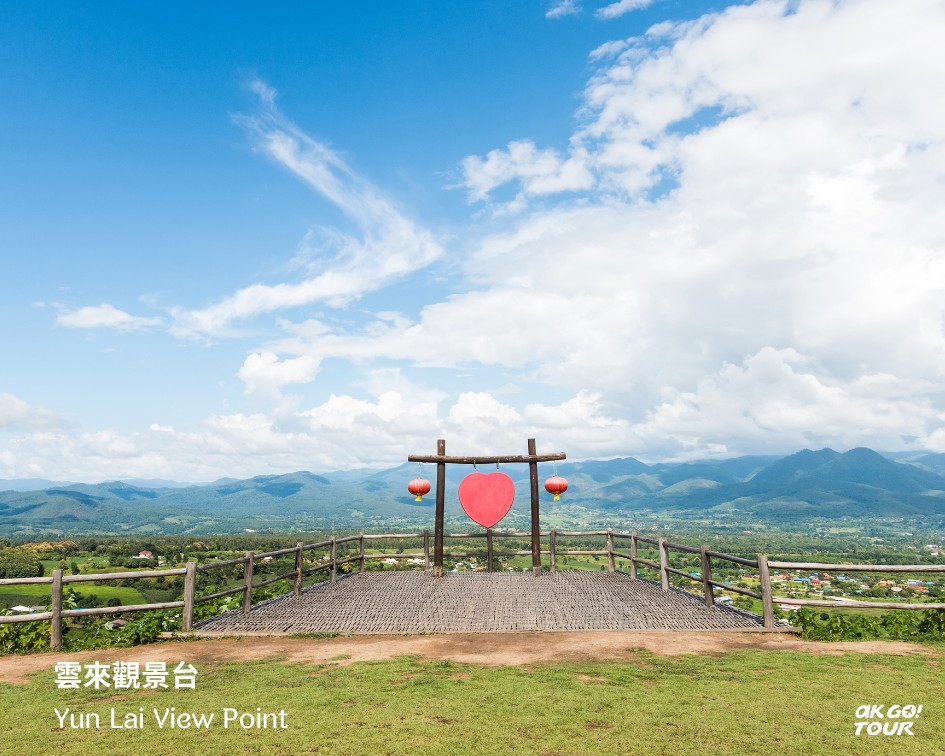 拜縣地勢高,觀景點海拔約1350公尺。有機會的話,可以看見雲霧包圍著拜縣,猶如雲朵從四面八方來到觀景台一樣,因此得名「雲來」。