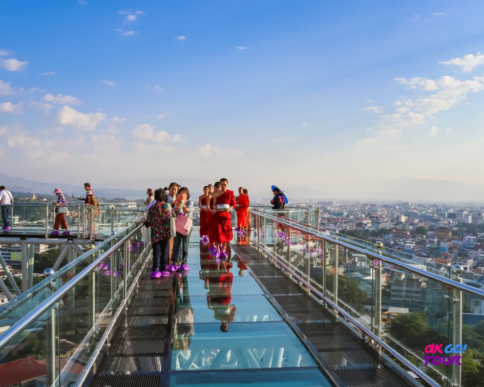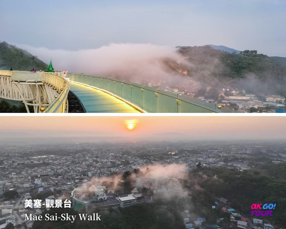 遊客可套上鞋套,進入玻璃棧道,俯瞰泰國最北的城市-美塞,也能看到緬甸的大其力城市。不同時段都很美,時而山霧飄縹、時而陽光普照。