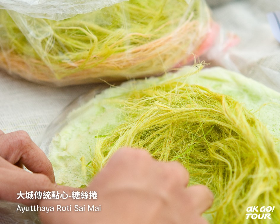 糖絲捲是大城當地特有的名產,因為做工複雜,目前仍多數為人工製作。細而柔滑的糖絲,有點像龍鬚糖,但更綿密鬆軟,入口即化。綠色是使用香蘭葉的顏色,可以單吃,也能用薄春捲皮捲起來食用,是泰國慶典中具有好運及祈福的獨特甜點。曼谷比較難找,在大城記得多吃一點!