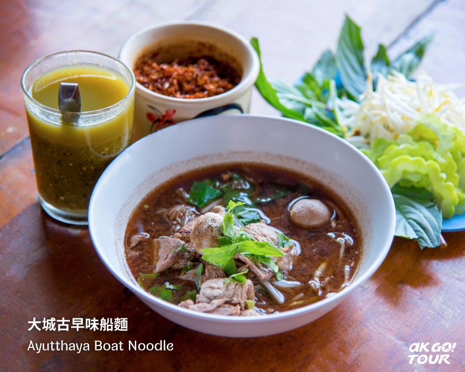 到大城,一定要試試船麵!早年的泰國水上生活的文化之一,就是在船上快速烹製一碗麵,先在小碗裡放麵和料,再注入以香料燉煮的濃郁肉湯,香氣四溢。 船麵以小碗盛裝是為了方便遞上岸或在船上食用,通常不會盛滿湯以免溢出。