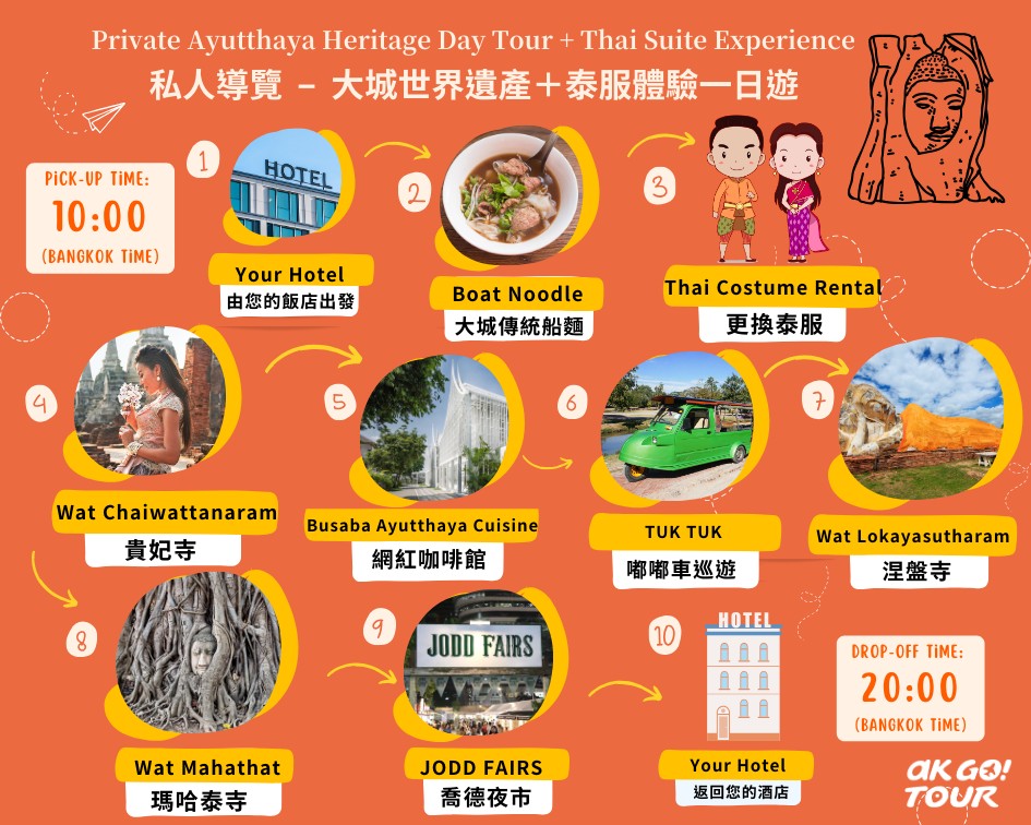 - 出行當日,可指定曼谷兩大機場BKK / DMK接送,或行程結束後送至機場,需支付350泰銖附加費。