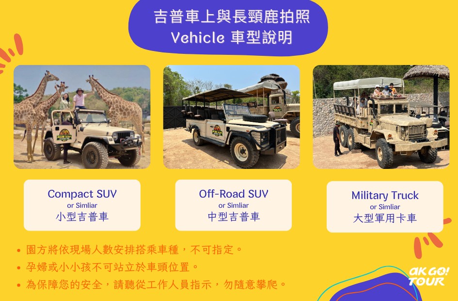 園方將依照預訂人數安排搭乘車種,共有小型吉普車、中型吉普車及大型軍用卡車等 3 種。(車款不可指定,由園方安排。)