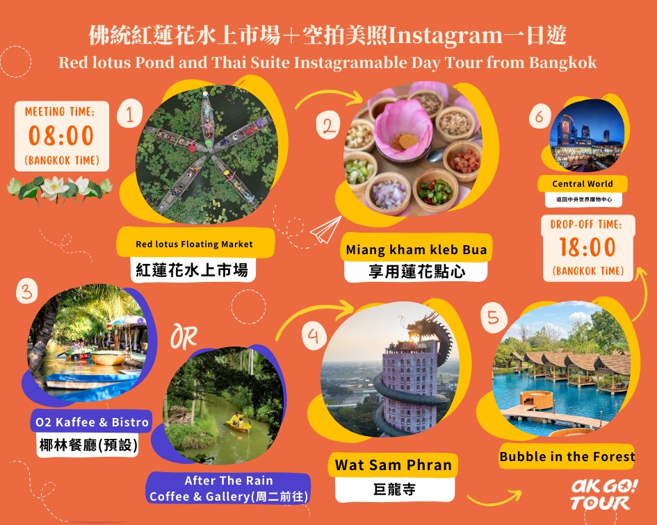 夢幻粉紅蓮花海,泰式傳統蓮花甜點,可以划小船的景觀餐廳,去吉祥意涵的17層樓巨龍廟求好運,一整天的戶外芬多精洗禮、身心舒暢。