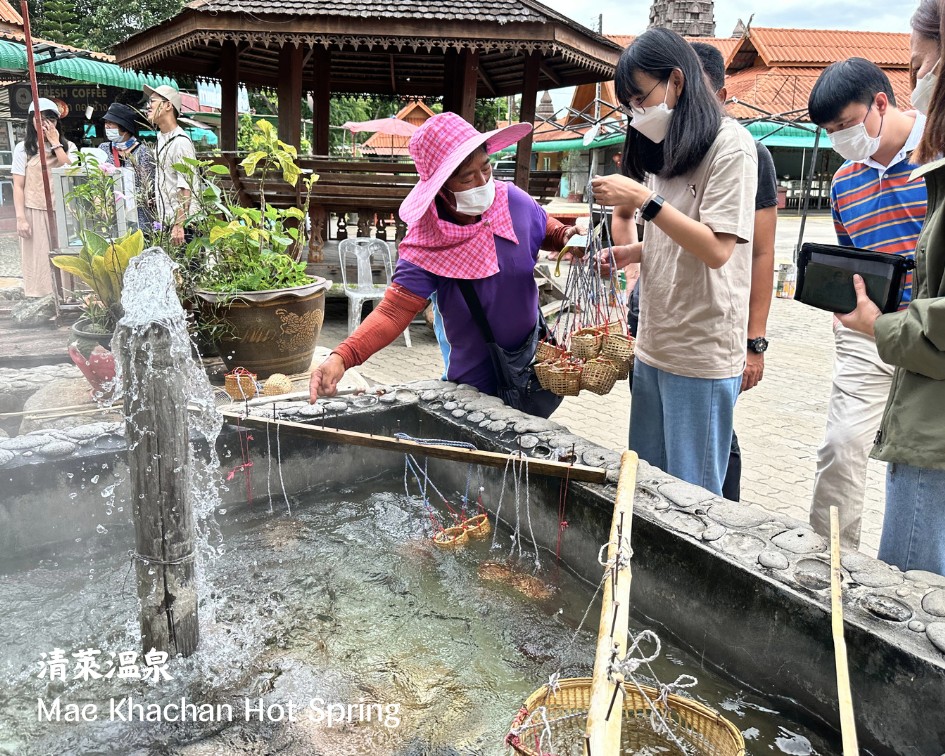 遊客可以買雞蛋或鵪鶉蛋,直接放進泉水裡燙熟後現吃,或是在溫泉裡泡泡腳,超放鬆。還有攤位賣當地特色小吃,在坐車的途中除了上廁所外,更親近泰國本土特色景點。