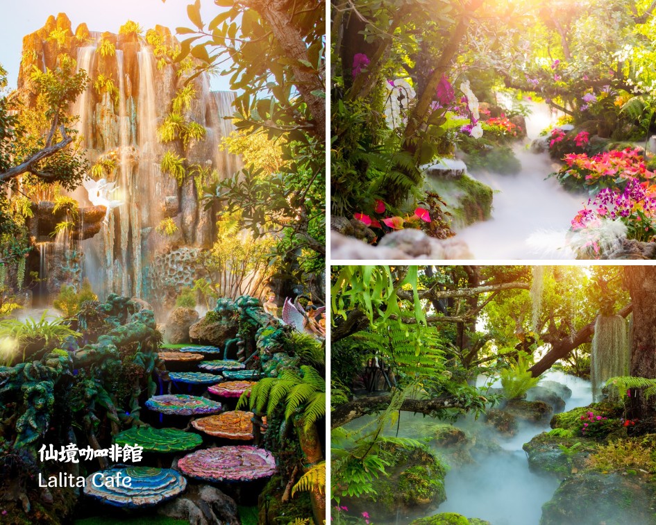 泰國的咖啡廳真的太厲害!宛如闖入愛麗絲夢遊仙境~一走進去,就會被超大的瀑布吸引住,水聲和滿滿的綠意讓人瞬間放鬆,還有各種漂亮的蘭花、花朵點綴,感覺像進入了天堂小仙境。