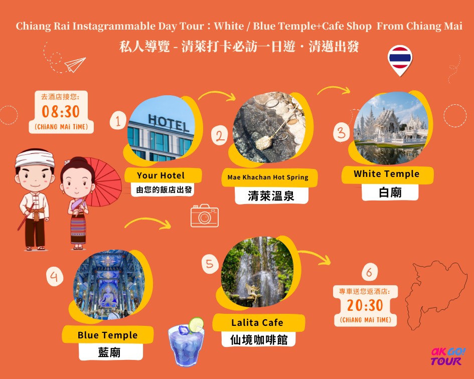 白廟的莊嚴、藍廟的神秘、Maekhachan溫泉的悠閒,再加上Lalitta咖啡館的夢幻美景,絕對是最時麾的玩法!