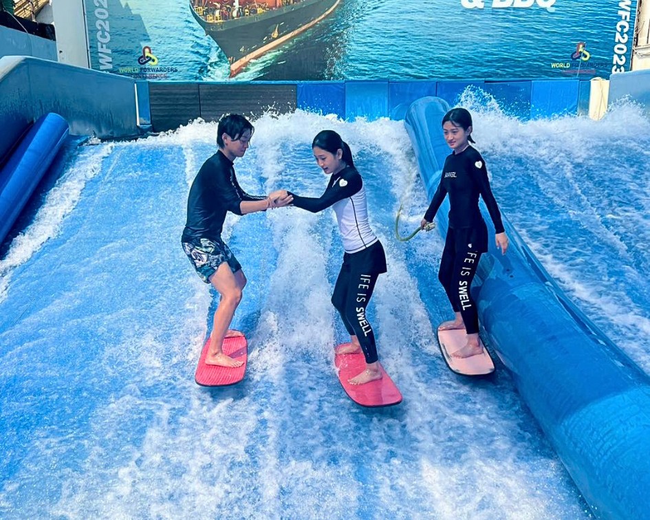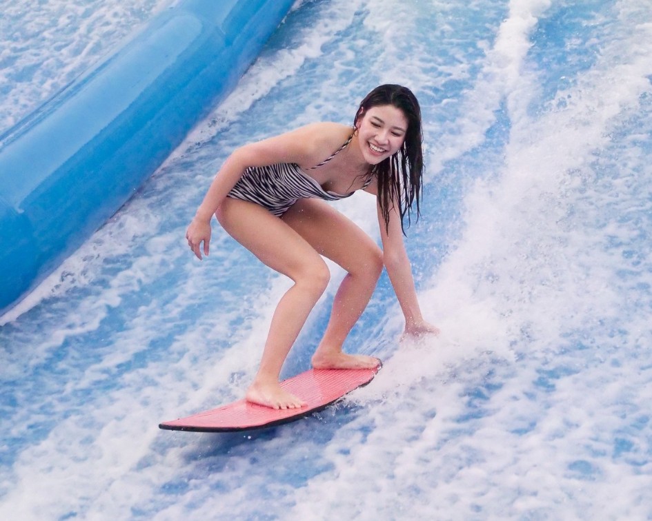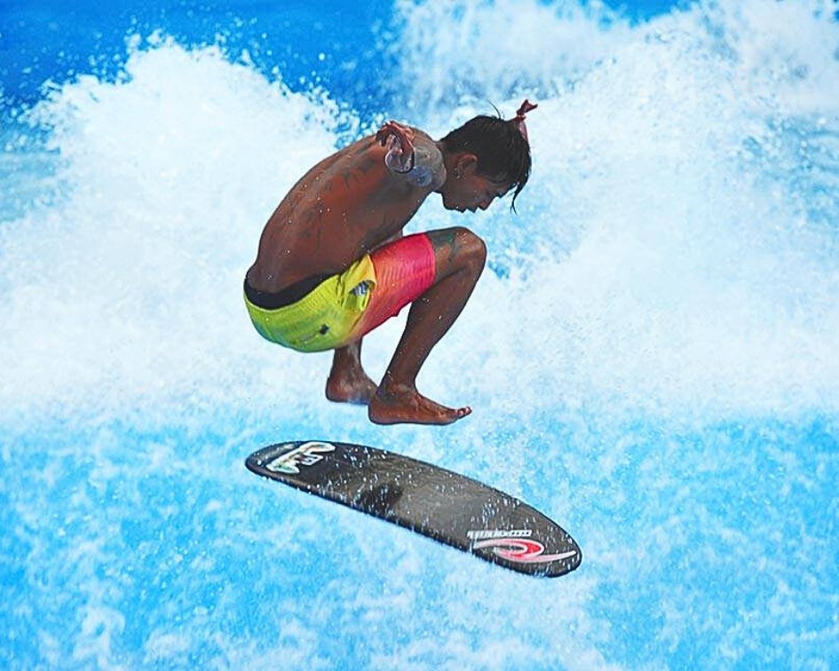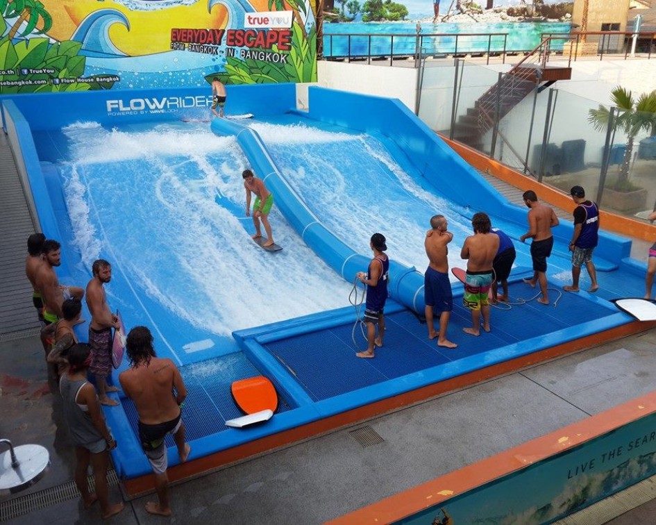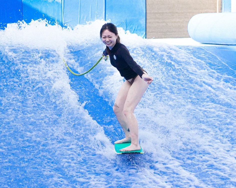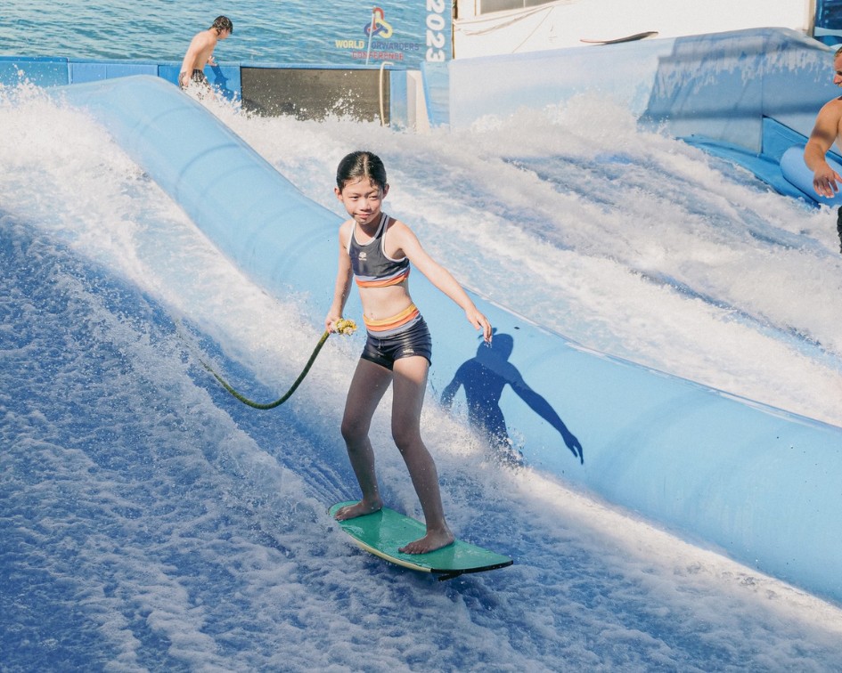 在人造浪設施Flowrider中,體驗立式衝浪和趴板衝浪。掌握衝浪技巧、保持身體平衡、善用身體重心控制方向,很容易上手。